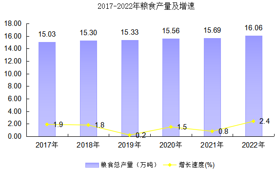 全年實現(xiàn)糧食產(chǎn)量160636噸,比上年增長2.4%。其中:夏糧10687噸,比上年下降1.2%;秋糧149949噸,增長2.6%。