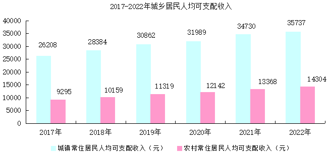 農(nóng)村常住居民人均可支配收入14304元,比上年增長7.0%,城鎮(zhèn)常住居民人均可支配收入35737元,比上年增長2.9%。