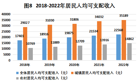 全體居民人均可支配收入22560元,比上年增長4.8%。城鎮(zhèn)居民人均可支配收入35189元,比上年增長3.4%。農(nóng)村居民人均可支配收入14862元,比上年增長6.8%。