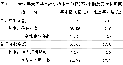 年末金融機構(gòu)本外幣各項存款余額119.99億元,比年初增加3.44億元,其中住戶存款96.56億元,比年初增加10.36億元。年末金融機構(gòu)本外幣各項貸款余額96.41億元,比年初增加11.50億元。