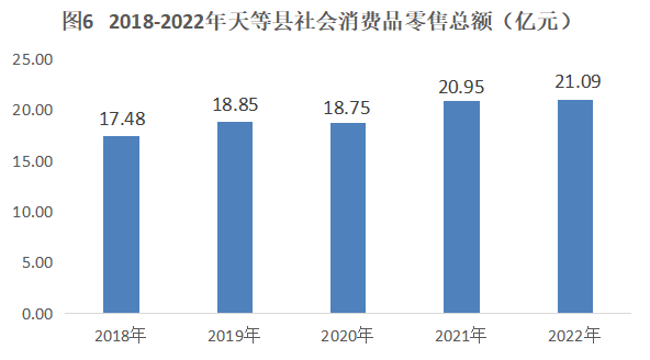 全年社會消費品零售總額21.09億元,比上年增長0.7%。按經(jīng)營地統(tǒng)計,城鎮(zhèn)消費品零售額16.48億元,增長1.2%;鄉(xiāng)村消費品零售額4.61億元,下降1.2%。按消費類型統(tǒng)計,商品零售額19.61億元,增長0.4%;餐飲收入額1.48億元,增長4.8%。