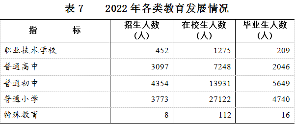 職業(yè)技術(shù)學(xué)校招生452人,在校生1275人,畢業(yè)生209人。普通高中招生3097人,在校生7248人,畢業(yè)生2046人。普通初中招生4354人,在校生13931人,畢業(yè)生5649人。普通小學(xué)招生3773人,在校生27122人,畢業(yè)生4740人。特殊教育招生8人,在校生112人,畢業(yè)生16人。學(xué)前教育在園幼兒9498人。九年義務(wù)教育鞏固率97.78%,高中階段毛入學(xué)率93.8%。