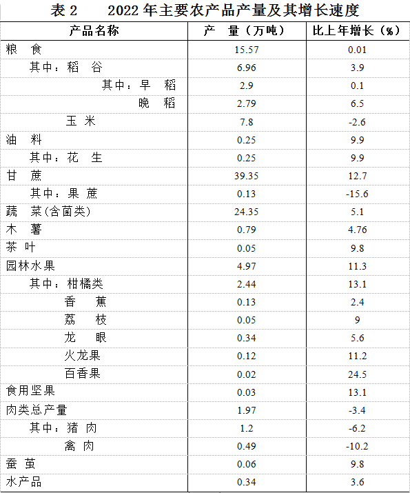 甘蔗產(chǎn)量39.35萬噸,增產(chǎn)12.7%。蔬菜產(chǎn)量(含食用菌)24.35萬噸,增產(chǎn)5.1%。園林水果產(chǎn)量4.97萬噸,增產(chǎn)11.3%。