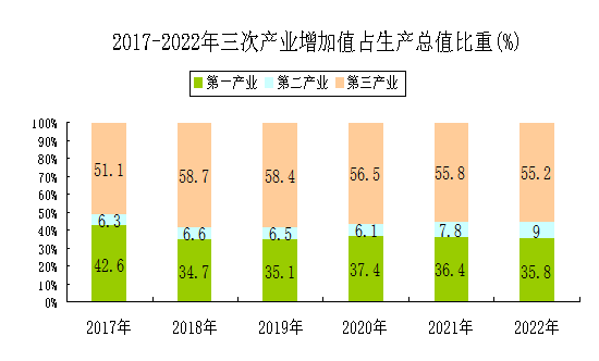 初步測算,全年地區(qū)生產(chǎn)總值實(shí)現(xiàn)135.4億元,按基期不變價(jià)格計(jì)算,比上年增長6.2%。其中,第一產(chǎn)業(yè)增加值48.5億元,同比增長2.7%;第二產(chǎn)業(yè)增加值12.1億元,同比增長16.3%;第三產(chǎn)業(yè)增加值74.8億元,同比增長7.3%;全年人均地區(qū)生產(chǎn)總值21481元。三次產(chǎn)業(yè)的結(jié)構(gòu)由上年的36.4:7.8:55.8調(diào)整為35.8:9.0:55.2。三次產(chǎn)業(yè)對GDP增長的貢獻(xiàn)率分別是16.6%、18.9%和64.5%;拉動(dòng)GDP增長分別是1.02個(gè)、1.18個(gè)和4.01個(gè)百分點(diǎn)。