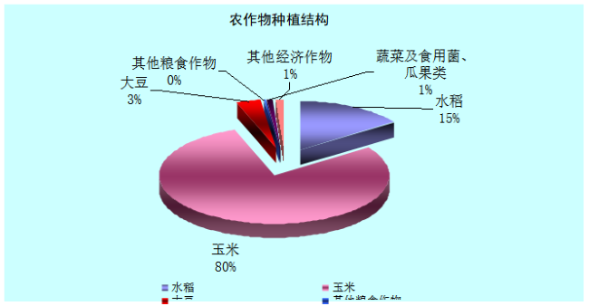 糧食作物播種面積85834公頃,其中,水稻面積13406公頃,玉米面積69366公頃,大豆面積2972公頃,其他面積90公頃。經(jīng)濟作物播種面積1785公頃,其中,蔬菜及食用菌面積875公頃,瓜果類面積27公頃,中草藥材面積409公頃,其他面積474公頃。