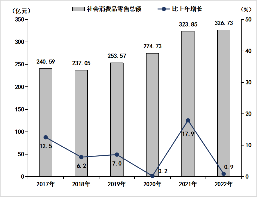 消費品市場回暖復(fù)蘇。全年實現(xiàn)社會消費品零售總額326.73億元,比上年增長0.9%。按行業(yè)分,批發(fā)業(yè)銷售額1082.91億元,增長12.3%;零售業(yè)銷售額317.48億元,增長5.9%;住宿業(yè)營業(yè)額4.74億元,增長17.3%;餐飲業(yè)營業(yè)額40.32億元,增長8.4%。全年實現(xiàn)限額以上社會消費品零售總額140.03億元,比上年增長9.3%。