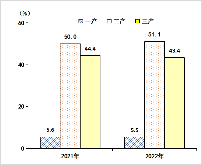 圖2:2021-2022年三次產(chǎn)業(yè)增加值占地區(qū)生產(chǎn)總值比重