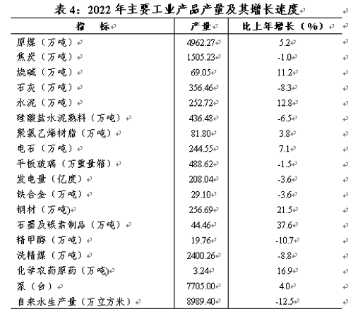 從主要工業(yè)產(chǎn)品產(chǎn)量看,原煤產(chǎn)量4962.27萬噸,增長5.2%;洗精煤產(chǎn)量2400.26萬噸,下降8.8%;鋼材產(chǎn)量256.69萬噸,增長21.5%;電石產(chǎn)量244.55萬噸,增長7.1%;水泥產(chǎn)量252.72萬噸,增長12.8%;平板玻璃產(chǎn)量488.62萬重量箱,下降1.5%;焦炭產(chǎn)量1505.23萬噸,下降1.0%;發(fā)電量208.04億千瓦時(shí),下降3.6%。