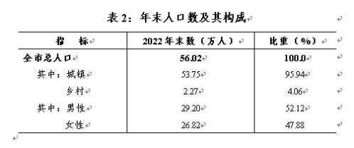 年末常住總?cè)丝?6.02萬人,比上年增加0.21萬人,其中城鎮(zhèn)人口53.75萬人,鄉(xiāng)村人口2.27萬人,常住人口城鎮(zhèn)化率達(dá)95.94%,比上年提高0.06個(gè)百分點(diǎn)。男性人口29.20萬人,女性人口26.82萬人。全年出生人口0.38萬人,人口出生率6.76‰,死亡人口0.39萬人,人口死亡率6.97‰。