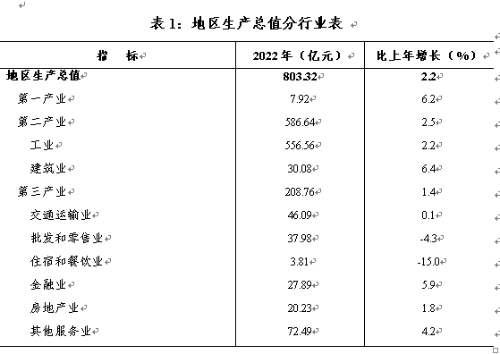 初步核算,全年地區(qū)生產(chǎn)總值完成803.32億元,按可比價(jià)格計(jì)算,比上年增長2.2%。其中,第一產(chǎn)業(yè)增加值7.92億元,增長6.2%;第二產(chǎn)業(yè)增加值586.64億元,增長2.5%;第三產(chǎn)業(yè)增加值208.76億元,增長1.4%。三次產(chǎn)業(yè)結(jié)構(gòu)為1.0:73.0:26.0。第一、二、三產(chǎn)業(yè)對(duì)地區(qū)生產(chǎn)總值增長的貢獻(xiàn)率分別為3.1%、75.3%和21.7%。人均地區(qū)生產(chǎn)總值達(dá)到143450元,比上年增長2.2%。
