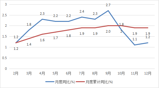 全年居民消費價格比上年上漲1.9%。分類別看,食品煙酒類上漲1.1%、衣著類下降1.2%、居住類上漲3.9%、生活用品及服務(wù)類下降0.1%、交通通信類上漲4.5%、教育文化和娛樂類上漲1.3%、醫(yī)療保健類下降1.0%、其他用品和服務(wù)類上漲1.5%。從工業(yè)生產(chǎn)角度看,工業(yè)生產(chǎn)者出廠價格比上年增長8.6%,工業(yè)品價格上漲3.7%。商品零售價格同比上漲1.6%。