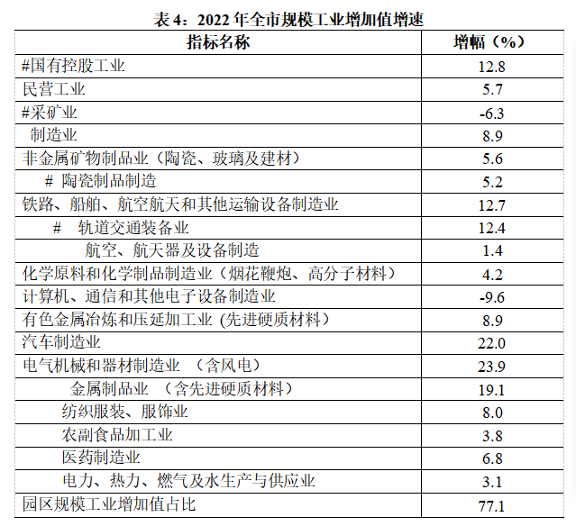 全年規(guī)模工業(yè)增加值增長8.3%,分經(jīng)濟類型看,國有控股工業(yè)增長12.8%,民營工業(yè)增長5.7%;分三大門類看,采礦業(yè)下降6.3%,制造業(yè)增長8.9%,電力、熱力、燃氣及水生產(chǎn)和供應業(yè)增長3.1%;分行業(yè)看,鐵路、船舶、航天航空和其他運輸設備制造業(yè)增長12.7 %,汽車制造業(yè)增長22.0 %,紡織服裝、服飾業(yè)增長8%,化學原料和化學制品制造業(yè)增長4.2 %,醫(yī)藥制造業(yè)增長6.8%、農(nóng)副食品加工制造業(yè)增長3.8 %,陶瓷制品制造業(yè)增長5.2%,有色金屬冶煉和壓延加工業(yè)增長8.9 %,計算機、通信和其他電子設備制造業(yè)下降9.6 %。省級及以上產(chǎn)業(yè)園區(qū)工業(yè)增加值增長10.4%,占規(guī)模工業(yè)比重為77.1%。全年規(guī)模工業(yè)企業(yè)營業(yè)收入增長7.7%,利潤增長32.5%。百元營業(yè)收入成本79.18?%,下降0.6%。