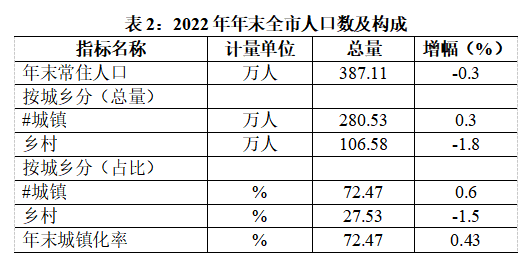 2022年,全市年末常住人口387.11萬人,較上年減少1.22萬人,其中,城鎮(zhèn)人口280.53萬人,較上年增加0.77萬人;鄉(xiāng)村人口106.58萬人,較上年減少1.99萬人;城鎮(zhèn)化率為72.47%,較上年提升0.43個百分點。