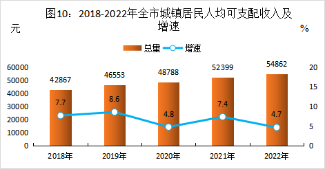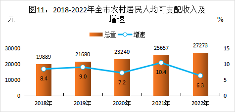 全年城鄉(xiāng)居民人均可支配收入44917元,增長5.9%。城鎮(zhèn)居民人均可支配收入54862元,增長4.7%,其中,工資性收入30797?元,經(jīng)營凈收入7024?元,轉(zhuǎn)移凈收入11626?元,財產(chǎn)凈收入5414?元。農(nóng)村居民人均可支配收入27273元,增長6.3%,其中,工資性收入12087?元,經(jīng)營凈收入8294?元,轉(zhuǎn)移凈收入5780?元,財產(chǎn)凈收入1112?元。城鄉(xiāng)居民收入比為2.01:1。全年城鄉(xiāng)居民人均消費支出28568?元,增長5.7%。城鎮(zhèn)和農(nóng)村居民人均消費支出分別為32443?元和21692?元,分別增長4.7%和6.3%。城鎮(zhèn)和農(nóng)村居民家庭恩格爾系數(shù)分別為27.9%和27.6%。