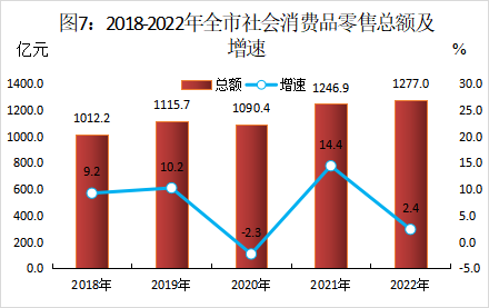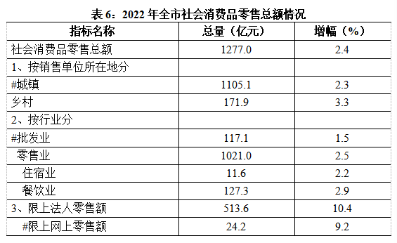 全年社會消費品零售總額1277.02億元,增長2.4%。分經(jīng)營地看,城鎮(zhèn)零售額1105.12億元,增長2.3%;鄉(xiāng)村零售額171.9億元,增長3.3%。分行業(yè)看,批發(fā)業(yè)117.1億元,增長1.5%,零售業(yè)1021億元,增長2.5%,住宿業(yè)11.6億元,增長2.2%,餐飲業(yè)127.3億元,增長2.9%。限額以上法人單位商品零售額513.6億元,增長10.4%,其中,糧油、食品類增長15%,煙酒類增長11.8%,服裝、鞋帽、針紡織品類增長3.3%,化妝品類增長8.2%,金銀珠寶類下降13.1%,日用品類增長19.5%,家用電器和音像器材類增長6.3%,中西藥品類增長14.3%,文化辦公用品類增長13.2%,家具類增長43.1%,通訊器材類增長7.9%,石油及制品類增長16.6%,汽車類增長6.5%,建筑及裝潢材料類增長22.7%。限額以上網(wǎng)上零售額24.2億元,增長9.2%。
