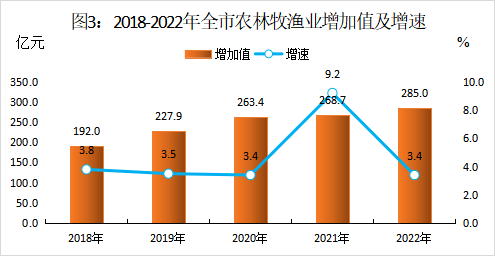 全年農(nóng)林牧漁業(yè)實現(xiàn)增加值285億元,增長3.4%。農(nóng)林牧漁業(yè)總產(chǎn)值429.43億元,增長3.4%。其中:農(nóng)業(yè)產(chǎn)值214.49億元,增長3.3%;林業(yè)產(chǎn)值33.63億元,增長3.0%;牧業(yè)產(chǎn)值145.76億元,增長2.9%;漁業(yè)產(chǎn)值18.77億元,增長3.5%;農(nóng)林牧漁服務業(yè)產(chǎn)值16.78億元,增長9.5%。全市糧食種植面積220.2千公頃,下降0.6%;全市蔬菜及食用菌面積83.96千公頃,增長1.6%;油料面積57.7千公頃,增長6.9%。