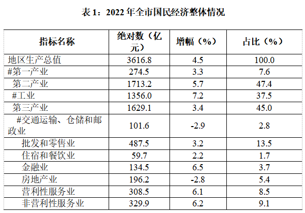 初步核算,全市地區(qū)生產(chǎn)總值3616.8億元,增長4.5%。其中,第一產(chǎn)業(yè)增加值274.5億元,增長3.3%;第二產(chǎn)業(yè)增加值1713.2億元,增長5.7%;第三產(chǎn)業(yè)增加值1629.1億元,增長3.4%。三次產(chǎn)業(yè)結(jié)構(gòu)分別為7.6:47.4:45。第一、二、三產(chǎn)業(yè)對GDP增幅的貢獻率分別為6.2%、59.3%和34.5%。全市人均GDP為93284元,增長4.9%。