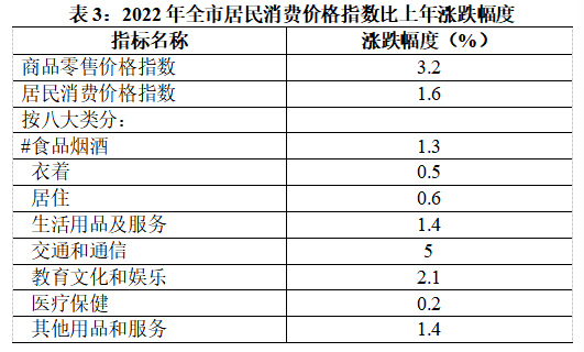 全年商品零售價格上漲3.2%。居民消費價格上漲1.6%,其中:食品煙酒價格上漲1.3%,衣著價格上漲0.5%,居住價格上漲0.6%,生活用品及服務價格上漲1.4%,交通和通信價格上漲5%,教育文化和娛樂價格上漲2.1%,醫(yī)療保健價格上漲0.2%,其他用品和服務價格上漲1.4%。