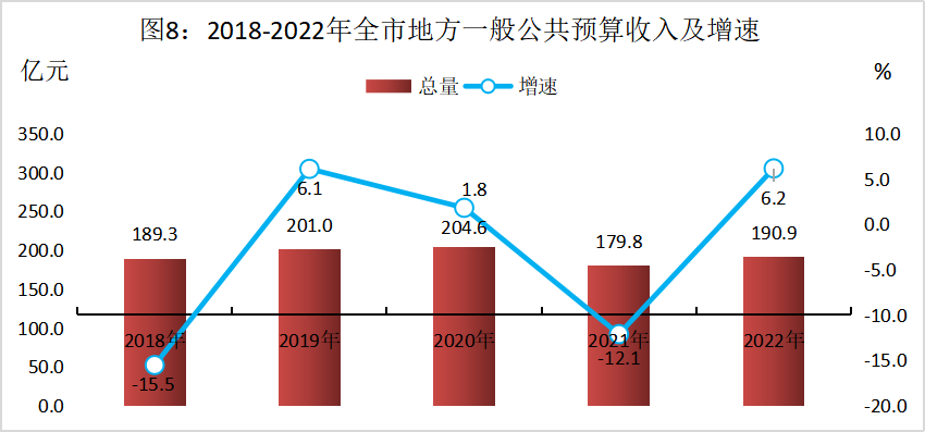 全市地方一般公共預算收入190.9億元,增長6.2%,其中,市本級完成52.6億元,增長24.3%;地方稅收收入136.2億元,占地方一般公共預算收入比重為71.3%。