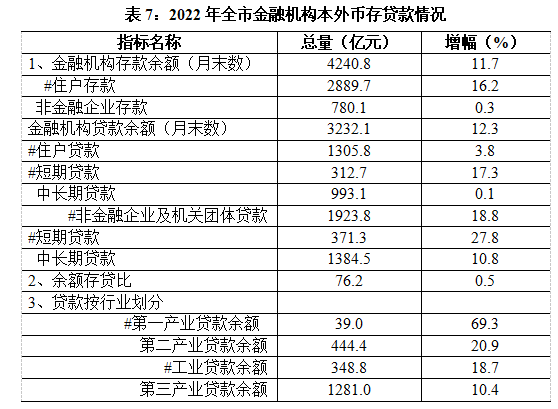 年末,金融機構(gòu)本外幣存款余額4240.8?億元,比上年末增長11.7%。其中,住戶存款余額2889.7?億元,增長16.2%;非金融企業(yè)存款余額780.1億元,增長0.3%。金融機構(gòu)本外幣貸款余額3232.1?億元,增長12.3?%。余額存貸比為76.2%。