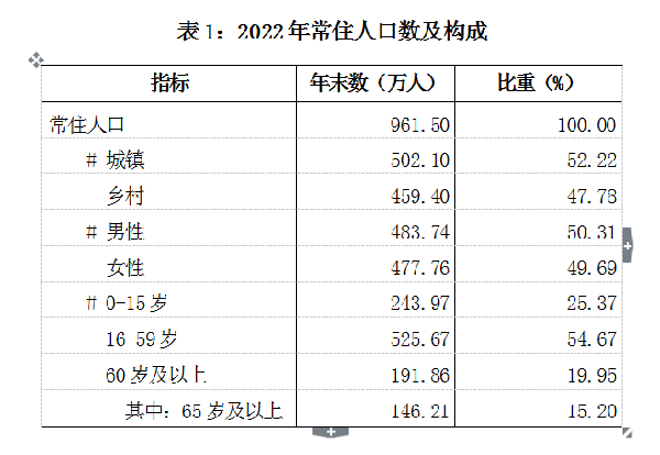 年末全市常住人口961.50萬人。其中城鎮(zhèn)常住人口502.10萬人,常住人口城鎮(zhèn)化率為52.22%。全年出生人口6.64萬人,出生率6.90‰;死亡人口7.85萬人,死亡率8.16‰;人口自然增長率為-1.26‰。