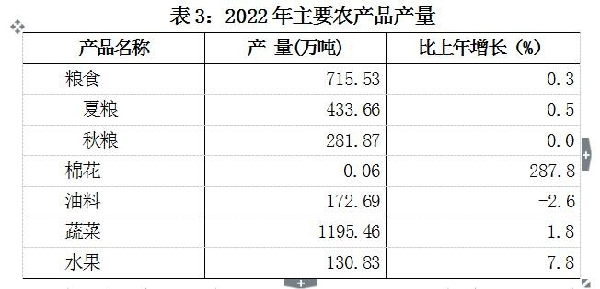 全年棉花產(chǎn)量0.06萬噸,增長287.8%。油料產(chǎn)量172.69萬噸,下降2.6%。蔬菜產(chǎn)量1195.46萬噸,增長1.8%。水果產(chǎn)量130.83萬噸,增長7.8%。