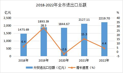 全年外貿(mào)進出口總額2219.70億元,比上年增長4.4%。其中,出口額為1870.20億,增長36.6%;進口額為349.50億元,下降53.9%。進出口差額(出口減進口)1520.70億元。
