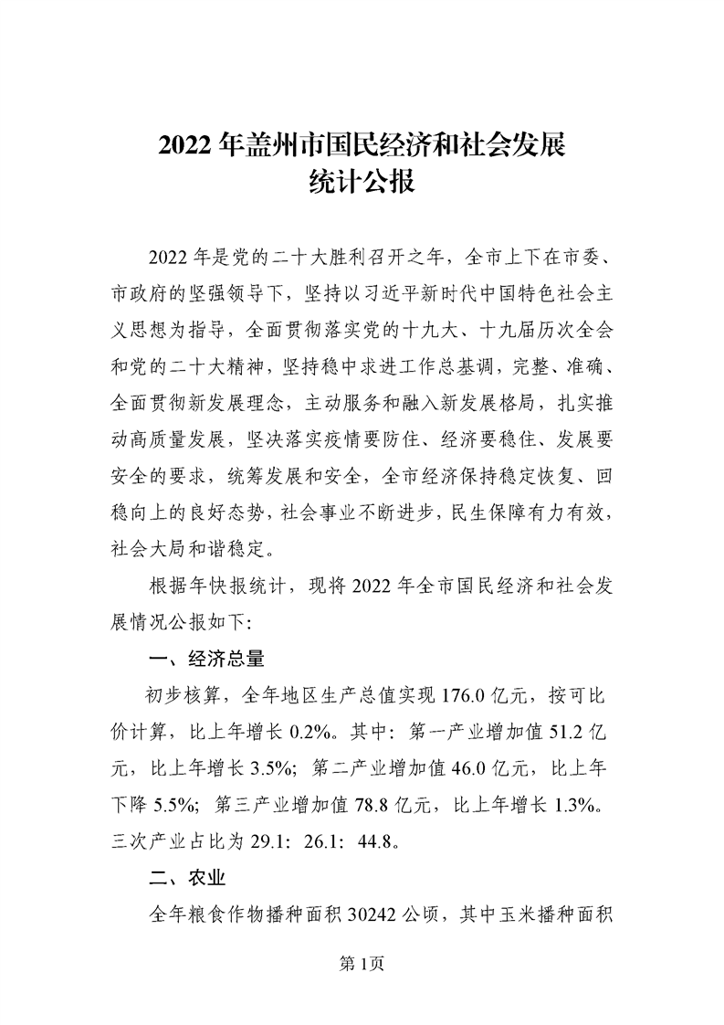 2022年?duì)I口市蓋州市人民政府國民經(jīng)濟(jì)和社會發(fā)展統(tǒng)計(jì)公報(bào)(2023年更新)