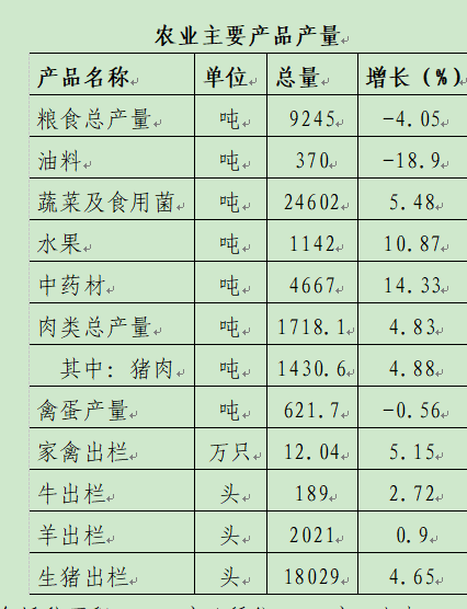 糧食播種面積40001畝(稻谷8566畝,小麥2242畝,玉米11684畝,豆類4759畝,薯類12651畝,其他谷物99畝);油料種植面積2513畝;蔬菜及食用菌種植面積8103畝;中藥材種植面積83851畝;園林水果面積7402畝。