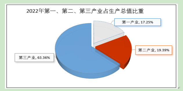 生產(chǎn)總值中,第一、第二和第三產(chǎn)業(yè)增加值占比分別為17.25%、19.39%和63.36%。與2021年相比,第一產(chǎn)業(yè)增加值占比下降0.45個(gè)百分點(diǎn),第二產(chǎn)業(yè)增加值占比提高0.59個(gè)百分點(diǎn),第三產(chǎn)業(yè)增加值占比下降0.14個(gè)百分點(diǎn)。