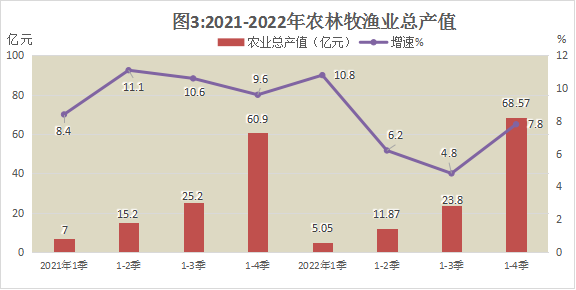 農(nóng)林牧漁業(yè)總產(chǎn)值68.57億元,同比增長7.8%,拉動GDP增長2.6個百分點(diǎn)。其中,種植業(yè)產(chǎn)值45.84億元,同比增長7.6%,拉動農(nóng)林牧漁業(yè)總產(chǎn)值增長5.4個百分點(diǎn);林業(yè)產(chǎn)值同比增長5.8%,拉動農(nóng)林牧漁業(yè)總產(chǎn)值增長0.1個百分點(diǎn);牧業(yè)產(chǎn)值同比增長10.1%,拉動農(nóng)林牧漁業(yè)總產(chǎn)值增長1.8個百分點(diǎn);漁業(yè)產(chǎn)值同比增長3.4%,拉動農(nóng)林牧漁業(yè)總產(chǎn)值增長0.1個百分點(diǎn);農(nóng)林牧漁專業(yè)及輔助性活動產(chǎn)值同比增長6.5%,拉動農(nóng)林牧漁業(yè)總產(chǎn)值增長0.4個百分點(diǎn)。