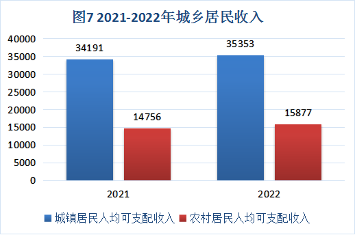 全體居民人均可支配收入23761元,比上年增長5.0%;城鎮(zhèn)居民人均可支配收入35353元,同比名義增長3.4%;農(nóng)村居民人均可支配收入15877元,同比名義增長7.6%。城鄉(xiāng)居民人均收入倍差2.27,比上年縮小0.05個百分點(diǎn)。