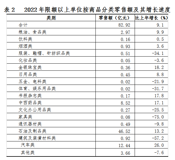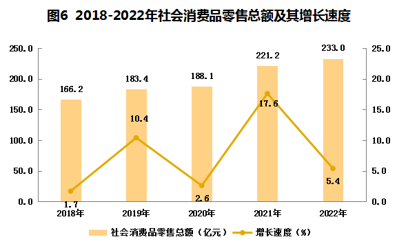 ? ?全年全區(qū)實(shí)現(xiàn)社會(huì)消費(fèi)品零售總額233.0億元,比上年增長(zhǎng)5.4%。其中,限額以上消費(fèi)品零售額84.6億元,增長(zhǎng)8.8%。按經(jīng)營(yíng)單位所在地分,城鎮(zhèn)消費(fèi)品零售額84.6億元,增長(zhǎng)8.8%,其中,城區(qū)消費(fèi)品零售總額實(shí)現(xiàn)84.1億元,增長(zhǎng)9.0%。按消費(fèi)類(lèi)型劃分,餐飲收入累計(jì)1.6億元,增長(zhǎng)13.5%;商品零售額82.9億元,增長(zhǎng)8.8%。