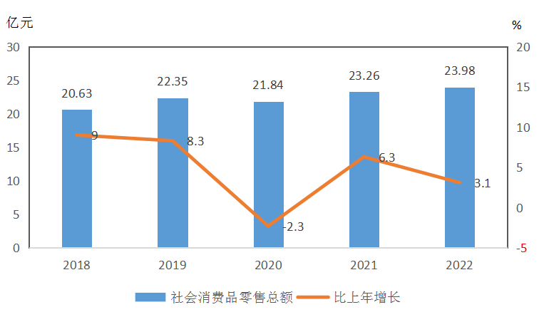 圖3??2018-2022年社會(huì)消費(fèi)品零售總額及增長(zhǎng)速度