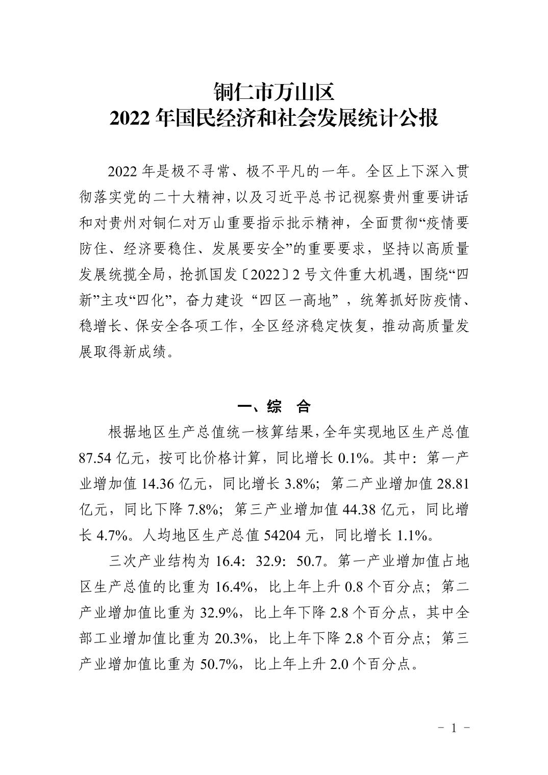 2022年銅仁市萬(wàn)山區(qū)人民政府國(guó)民經(jīng)濟(jì)和社會(huì)發(fā)展統(tǒng)計(jì)公報(bào)(2023年更新)