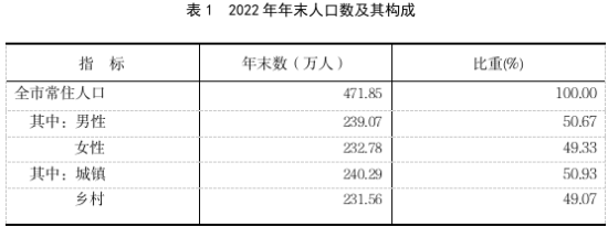 2022年年末全市常住人口為471.85萬人,比上年末減少1.47萬人。其中,城鎮(zhèn)常住人口240.29萬人,占常住人口比重為50.93%,比上年末提高0.67個百分點(diǎn)。全年出生人口3.20萬人,出生率為6.78‰;死亡人口4.00萬人,死亡率為8.46‰;自然增長率為-1.68‰。
