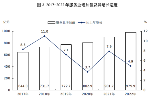 全年全市服務(wù)業(yè)增加值979.9億元,按不變價格計(jì)算,比上年增長4.9%。其中,交通運(yùn)輸、倉儲和郵政業(yè)增加值112.6億元,下降1.7%;批發(fā)和零售業(yè)增加值180.5億元,增長4.2%;住宿和餐飲業(yè)增加值15.8億元,增長1.1%;金融業(yè)增加值105.7億元,增長6.6%;房地產(chǎn)業(yè)增加值76.8億元,下降5.5%;其他服務(wù)業(yè)增加值464.1億元,增長8.8%。全年規(guī)模以上服務(wù)業(yè)企業(yè)營業(yè)收入比上年增長14.9%,利潤總額增長43.1%。