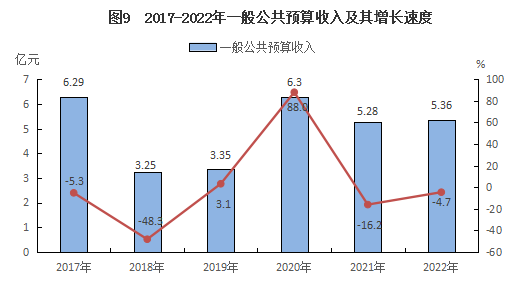 全年一般公共預(yù)算收入5.36億元,比上年下降1.7%,剔除增值稅留抵退稅因素后同口徑增長4.7%。其中,稅收收入2.05億元,下降16.8%,同口徑下降10.2%;非稅收入3.32億元,增長17.8%。一般公共預(yù)算支出22.98億元,增長2.0%。其中民生支出18.29億元,下降1.1%。支出情況如下:教育支出4.19億元,增長0.5%;科學(xué)技術(shù)支出0.23億元,增長440.6%;文化旅游體育與傳媒支出0.13億元,下降55.5%;社會保障和就業(yè)支出4.07億元,增長9.7%;衛(wèi)生健康支出2.03億元,增長5.0%;節(jié)能環(huán)保支出0.09億元,下降54.0%;城鄉(xiāng)社區(qū)支出1.32億元,增長26.4%;農(nóng)林水支出4.73億元,下降8.7%;交通運(yùn)輸支出0.36億元,下降65.5%;商業(yè)服務(wù)業(yè)等支出0.14億元,下降6.2%;自然資源海洋氣象等支出0.54億元,增長49.2%;住房保障支出0.43億元,增長81.5%;糧油物資儲備支出0.03億元,下降70.9%。