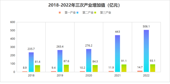 初步核算結(jié)果顯示,2022年全旗地區(qū)生產(chǎn)總值突破600億大關,達到614億元,同比增長5.4%。其中:第一產(chǎn)業(yè)實現(xiàn)增加值14.7億元,同比增長6.6%;第二產(chǎn)業(yè)實現(xiàn)增加值506.2億元,同比增長6.7%;第三產(chǎn)業(yè)實現(xiàn)增加值93.1億元,同比增長0.8%;三次產(chǎn)業(yè)占比為2.4:82.4:15.2。2022年人均地區(qū)生產(chǎn)總值達到369850元,同比增長4.0%。