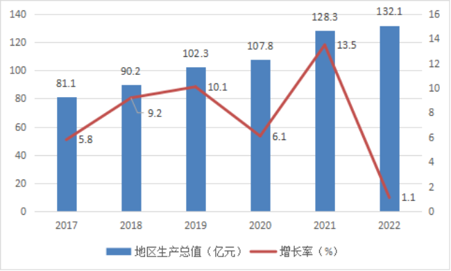 初步核算,全年實現(xiàn)地區(qū)生產(chǎn)總值132.08億元,同比增長1.1%。其中,第一產(chǎn)業(yè)增加值34.81億元,增長3.2%,對地區(qū)生產(chǎn)總值增長的貢獻(xiàn)率為76.1%;第二產(chǎn)業(yè)增加值35.02億元,下降2.7%,對地區(qū)生產(chǎn)總值增長的貢獻(xiàn)率為-60.2%;第三產(chǎn)業(yè)增加值62.25億元,增長2.0%,對地區(qū)生產(chǎn)總值增長的貢獻(xiàn)率為84.1%。三次產(chǎn)業(yè)結(jié)構(gòu)由2021年的26.9:27.5:45.6調(diào)整為26.4:26.5:47.1。按常住人口計算,人均生產(chǎn)總值40871元,增長0.9%。本年,消費品價格上漲2.5%,服務(wù)項目價格下降0.1%。