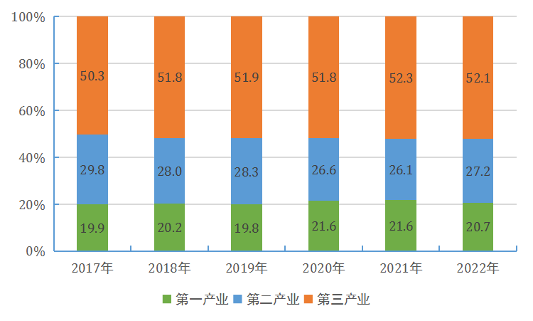 圖2:2017—2022年三次產(chǎn)業(yè)增加值占地區(qū)生產(chǎn)總值比重