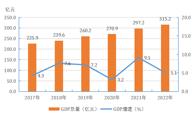 圖1:2017—2022年新野地區(qū)生產(chǎn)總值及增長速度