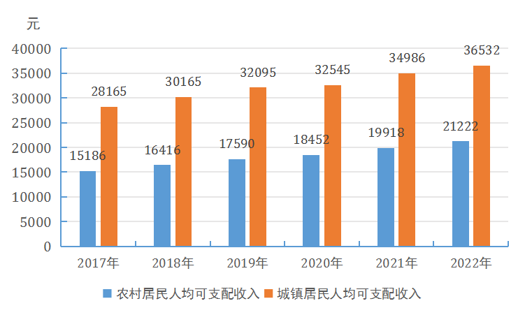 2022年城鄉(xiāng)居民可支配收入26911.3元,比上年增長5.6%;城鄉(xiāng)居民人均家庭總收入29198元,增長5.4%;人均消費(fèi)支出17020.2元,增長4.5%,其中,食品消費(fèi)支出5107.5元,比上年增長14.3%。