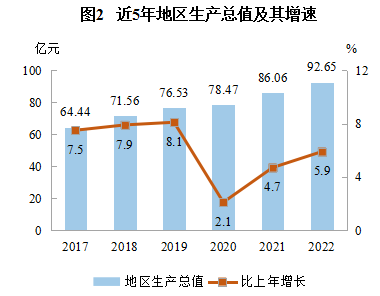 初步核算,2022年全縣生產(chǎn)總值(GDP)92.65億元,按可比價格計算,比上年增長5.9%。其中,第一產(chǎn)業(yè)增加值8.13億元,第二產(chǎn)業(yè)增加值31.94億元,第三產(chǎn)業(yè)增加值52.58億元,分別增長4.1%、5.8%和6.2%。一季度、上半年、前三季度全縣生產(chǎn)總值同比分別增長5.5%、4.1%和5.7%。人均地區(qū)生產(chǎn)總值為65019元(按年平均匯率折算為9667美元),增長6.2%。