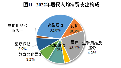 全年居民人均消費支出25050元,比上年增長8.0%。按常住地分,城鎮(zhèn)和農(nóng)村居民人均生活消費支出分別為32826元和17443元,分別增長7.3%和9.0%。