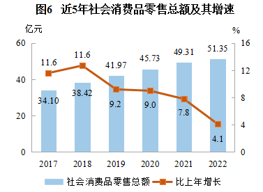 全年社會消費品零售總額51.35億元,比上年增長4.1%。其中,限額以上社會消費品零售總額7.19億元,增長35.6%。