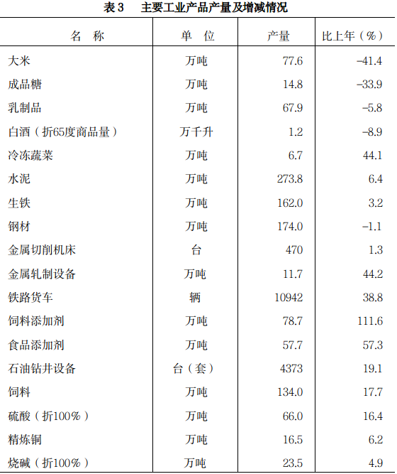 工業(yè)生產(chǎn)。全年規(guī)模以上工業(yè)增加值比上年增長(zhǎng)4.3%。按輕重工業(yè)分,輕工業(yè)下降1.5%,重工業(yè)增長(zhǎng)13.4%。按行業(yè)分,裝備工業(yè)增長(zhǎng)37.5%,食品工業(yè)下降0.5%,冶金工業(yè)下降1.6%,能源工業(yè)下降18.7%,醫(yī)藥工業(yè)下降16.8%,石化工業(yè)下降7.0%,林木建材工業(yè)下降17.6%,其他工業(yè)增長(zhǎng)9.9%。
