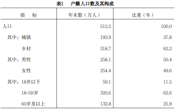 人口。全市戶(hù)籍總?cè)丝?12.5萬(wàn)人。其中,鄉(xiāng)村人口318.7萬(wàn)人;城鎮(zhèn)人口193.9萬(wàn)人。全年出生人口14660人,出生率為2.9‰;死亡人口29526人,死亡率為5.8‰;人口自然增長(zhǎng)率為-2.9‰。