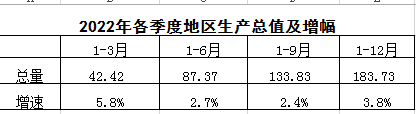 2022年實現(xiàn)地區(qū)生產(chǎn)總值183.73億元,按可比價格計算,比上年增長3.8%。其中:第一產(chǎn)業(yè)增加值為40.19億元,增長5.0%;第二產(chǎn)業(yè)增加值為79.68億元,增長4.9%,其中工業(yè)增加值76.77億元,增長4.9%,建筑業(yè)增加值2.91億元,增長5.6%;第三產(chǎn)業(yè)增加值63.86億元,增長1.7%。三次產(chǎn)業(yè)對經(jīng)濟增長的貢獻率分別為29.0%、54.6%、16.4%,分別拉動經(jīng)濟增長1.1、2.1、0.6個百分點。三次產(chǎn)業(yè)結構比為21.9:43.4:34.7。人均地區(qū)生產(chǎn)總值80585元,增長3.3%。