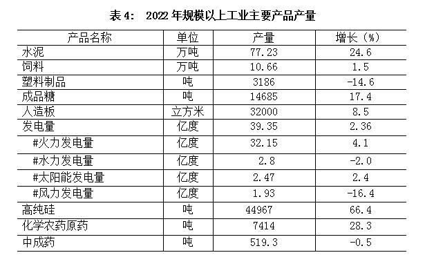 全年規(guī)模以上工業(yè)生產(chǎn)水泥77.23萬噸,同比增長24.6%;飼料10.66萬噸,增長1.5%;高純硅44967萬噸,增長66.4%;塑料制品3186噸,下降14.6%;成品糖14685噸,增長17.4%;人造板32000立方米,增長8.5%;化學(xué)農(nóng)藥7414噸,增長28.3%;中成藥519.3噸,下降0.5%;發(fā)電量39.35億千瓦小時,增長2.36%。